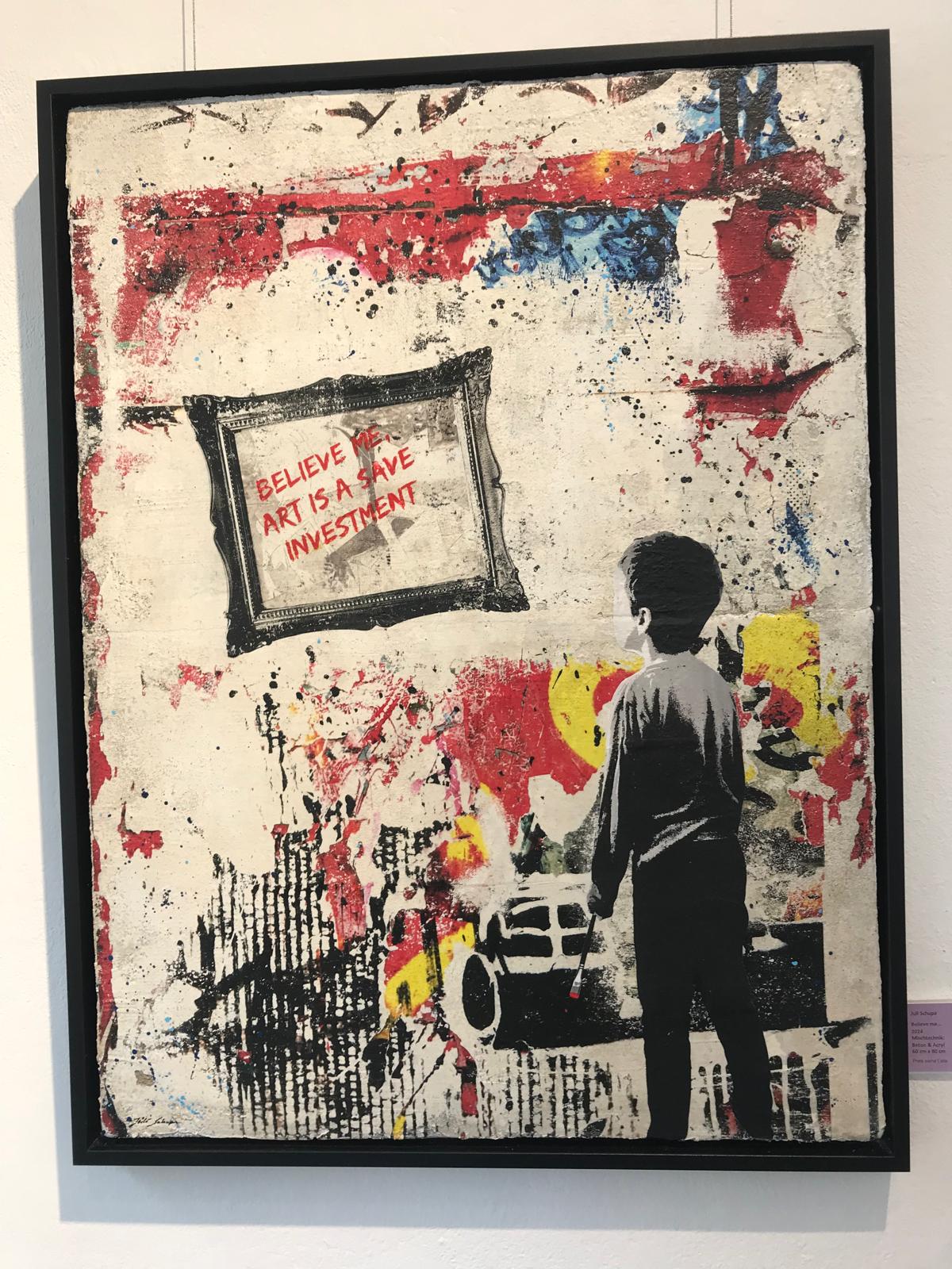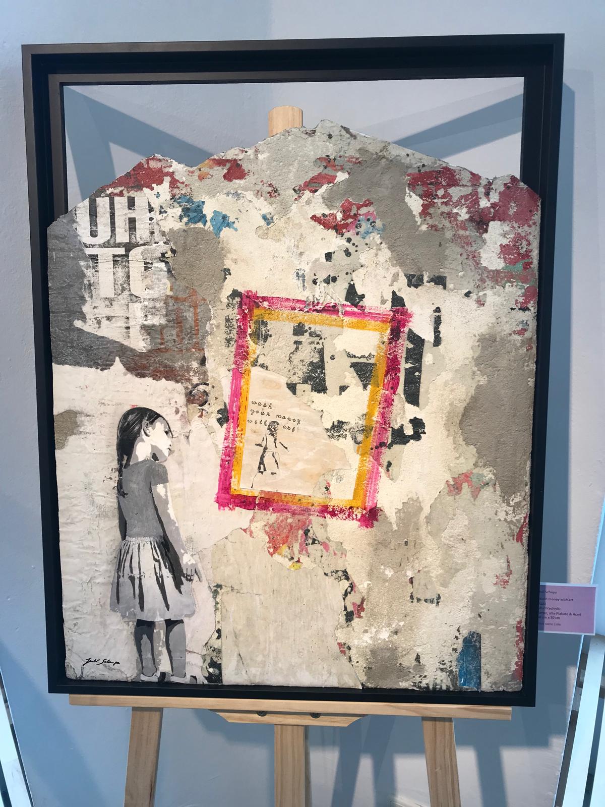 Juli Schupas „concrete artworks“ sind Mixed-Media-Werke auf Beton-/Zementuntergrund, die sie mit Acrylfarben, Spachtelmassen, Fliesen und anderen Materialien kombiniert. Inspiriert von Streetart und Architektur erschafft sie Außenkunst für Innenräume (Text von ihrer Website).