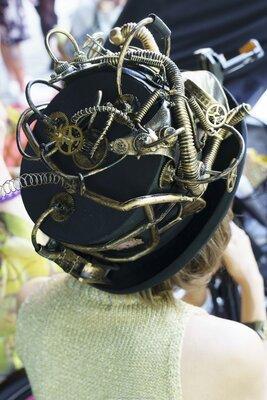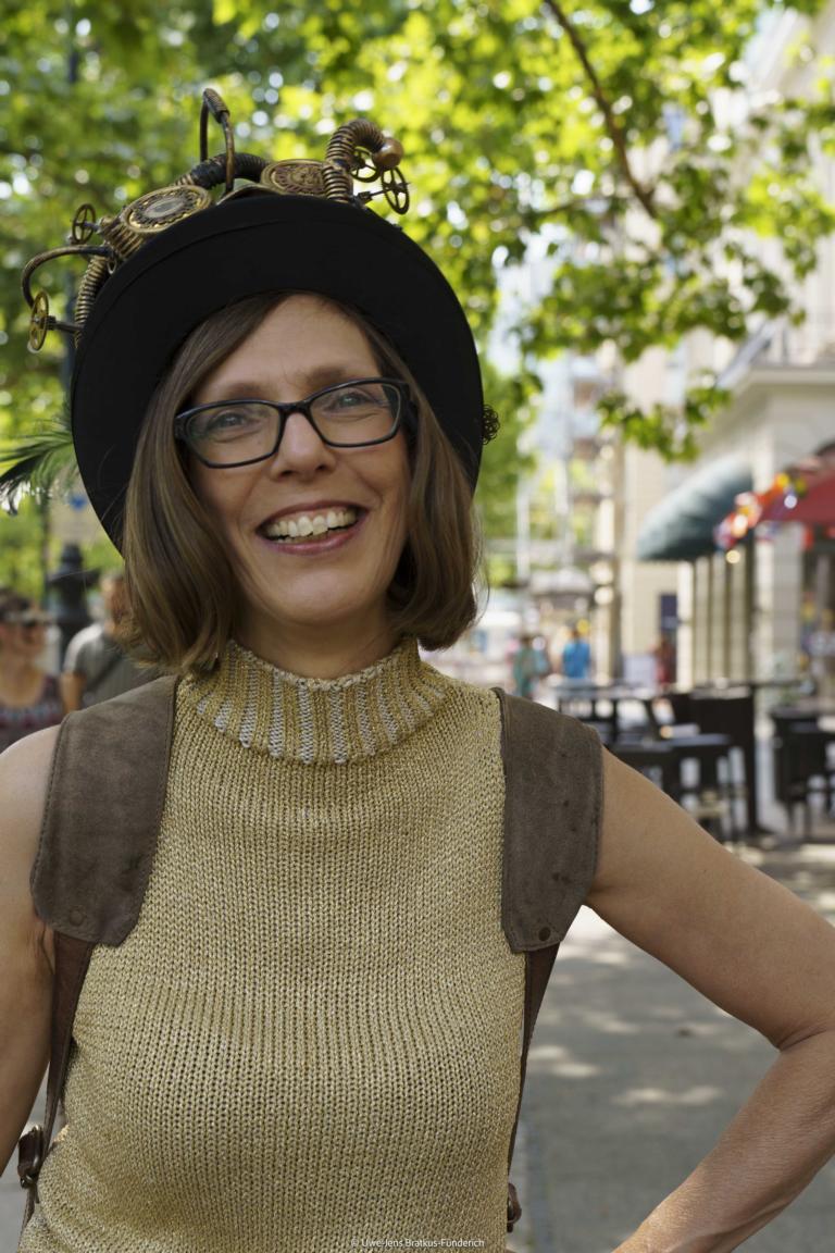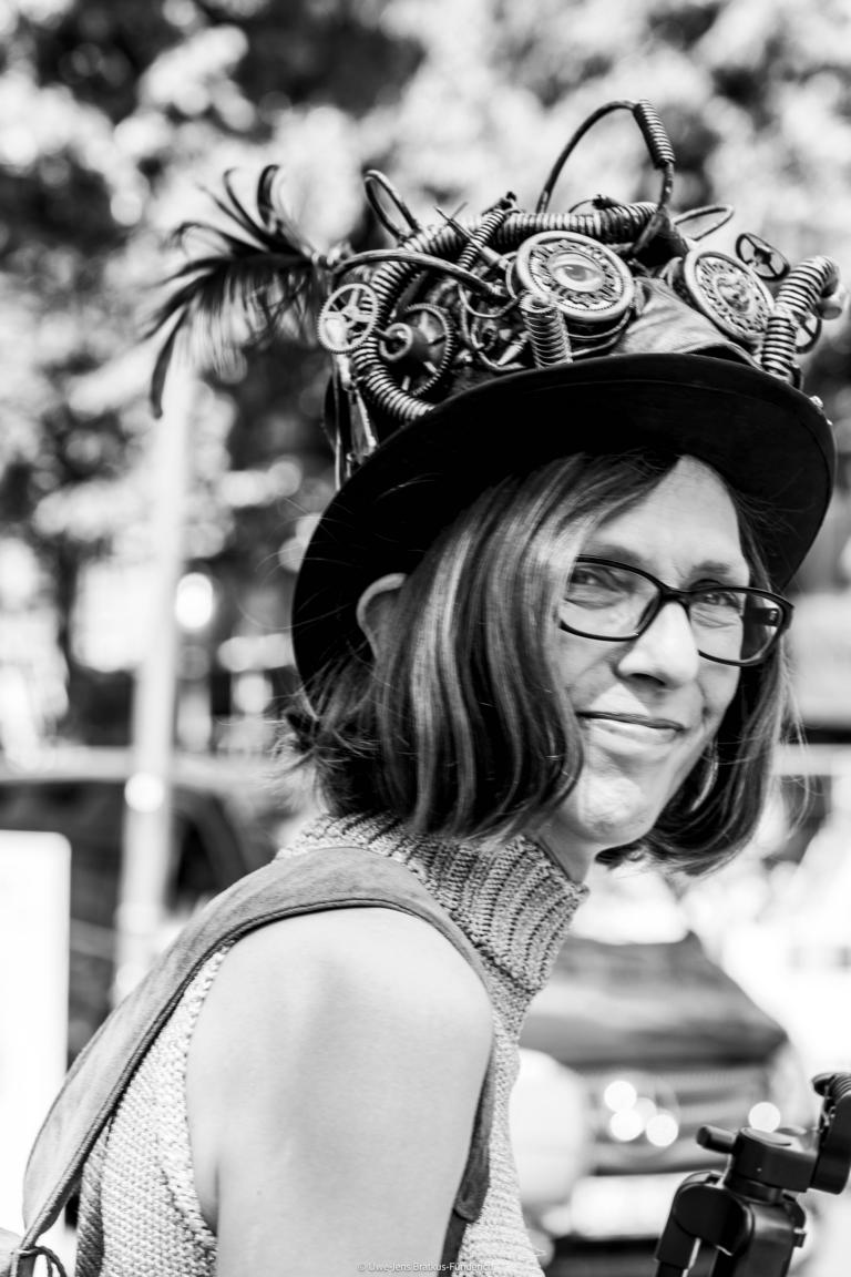 Gianni und Carlos Klein, in deren Mitte ich stehe, sind HatArtisten aus dem Berliner Charlottenburg – welch ein Glück, wer sie kennt und wer in Genuss einer sensationellen Kopfbedeckung von ihnen kommt! Das isser nun: mein neuer Steampunkzylinder aus dem Hause C&G-Klein.