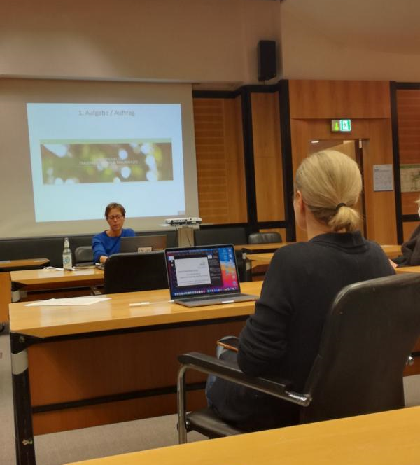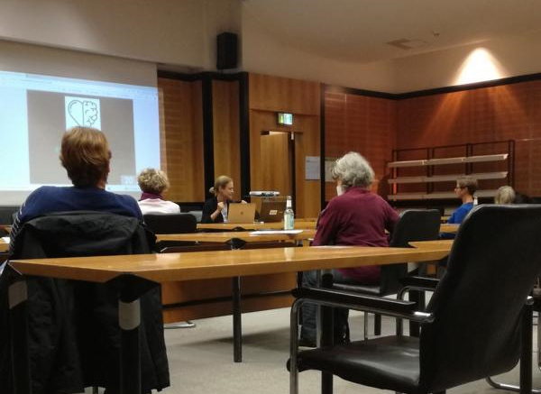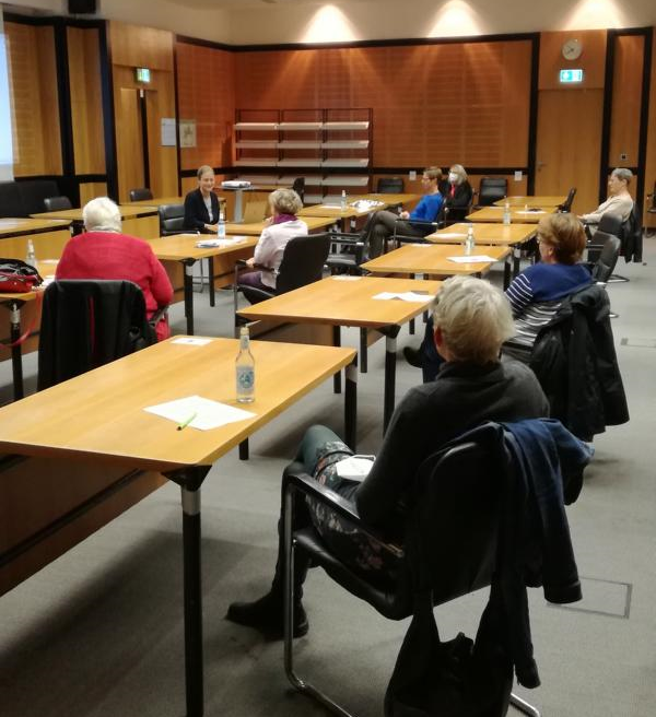 Nach dem Vortrag treffen sich die Teilnehmerinnen an Tischen
